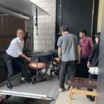 まずはいつもの文化会館から楽器を運び出し!慣れたものです。(余裕でポーズとっちゃうよ)