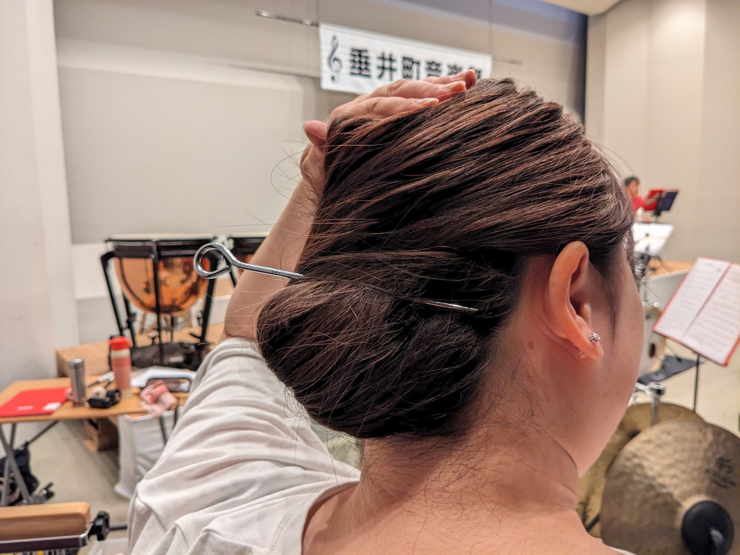 髪留めを忘れたそうで、なんとトライアングルなどを叩くビーターを使って、髪をまとめてます!